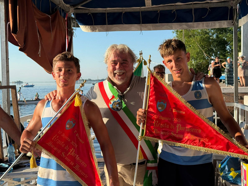 Mattia Furian e Alvise Favaretto vincono la regata di Portosecco in foto con il delegato alle tradizioni Giovanni Giusto